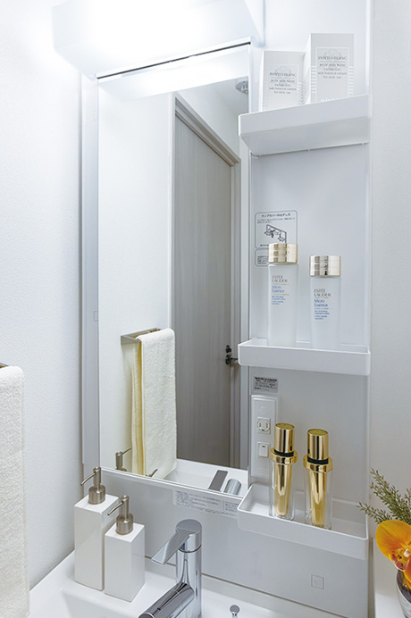 デザイン性と清掃性に優れた人造大理石をカウンターに採用。また、ミラー横には3段ラックが設置してあるので、煩雑になりがちな洗面化粧台周りをすっきりと保つことができます。