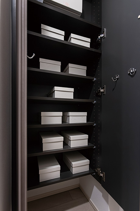 玄関には、トール型の下足入を設置。季節により使用頻度がかたよる靴もしっかり整理できます。