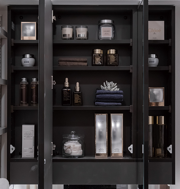 三面鏡の裏側に収納スペースを確保。スキンケア・ヘアケア用品などをすっきり整理できます。また収納棚は取り外して掃除ができるので清潔に保てます。