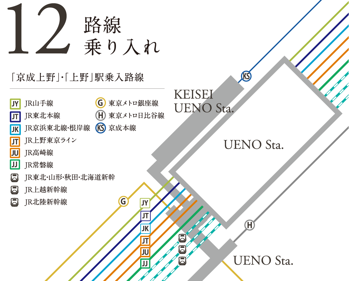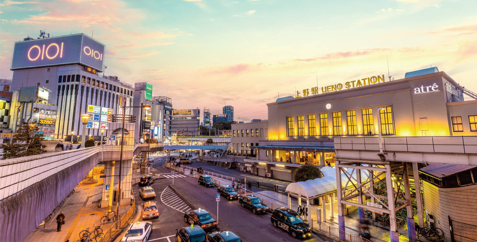 北からの玄関口として12路線が乗り入れる「上野」。「アメ横」をはじめとする多彩な商業施設とともに、豊かな緑あ ふれる自然につつまれる「上野恩賜公園」には、美術館や博物館など都内屈指の文化施設が集う。駅前の再開発計画などに より、街は更に進化し続けています。