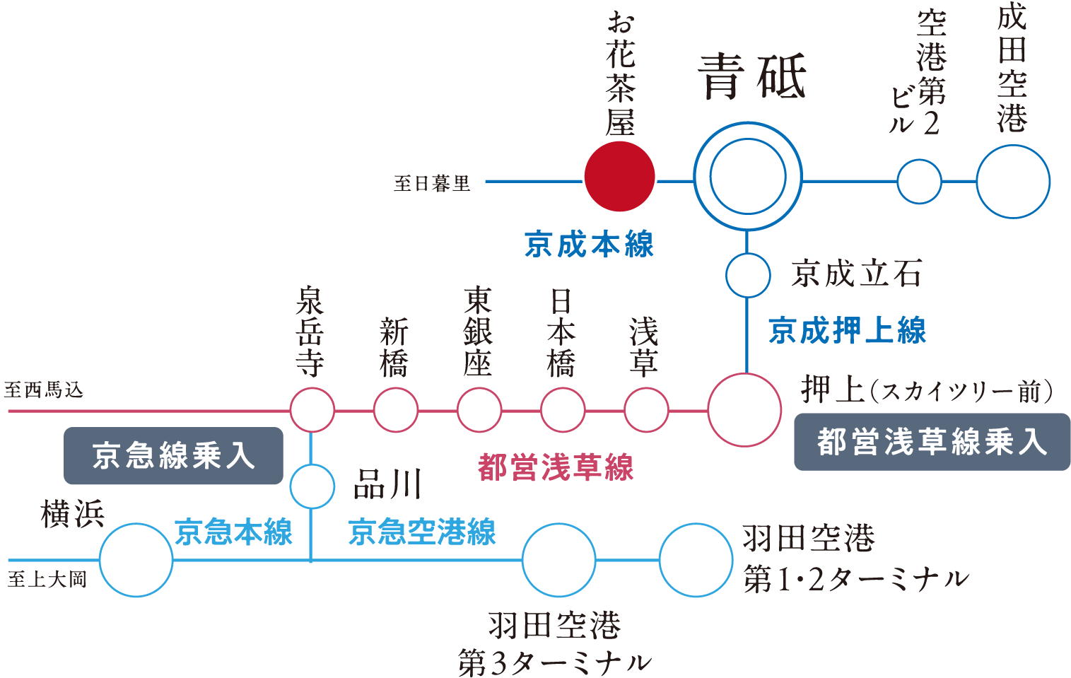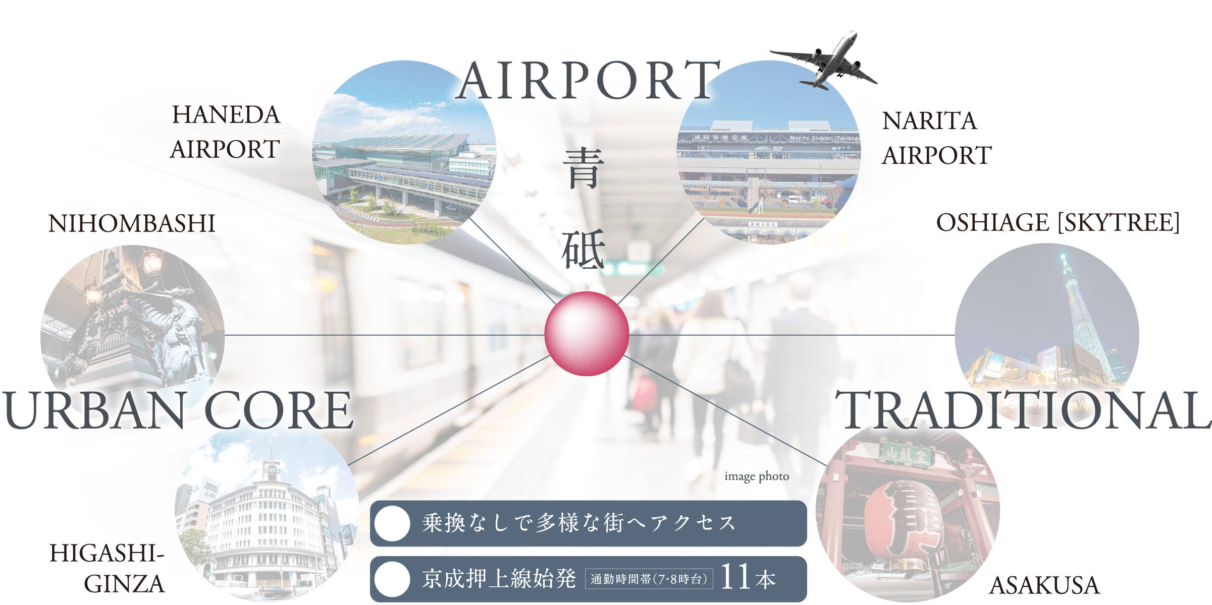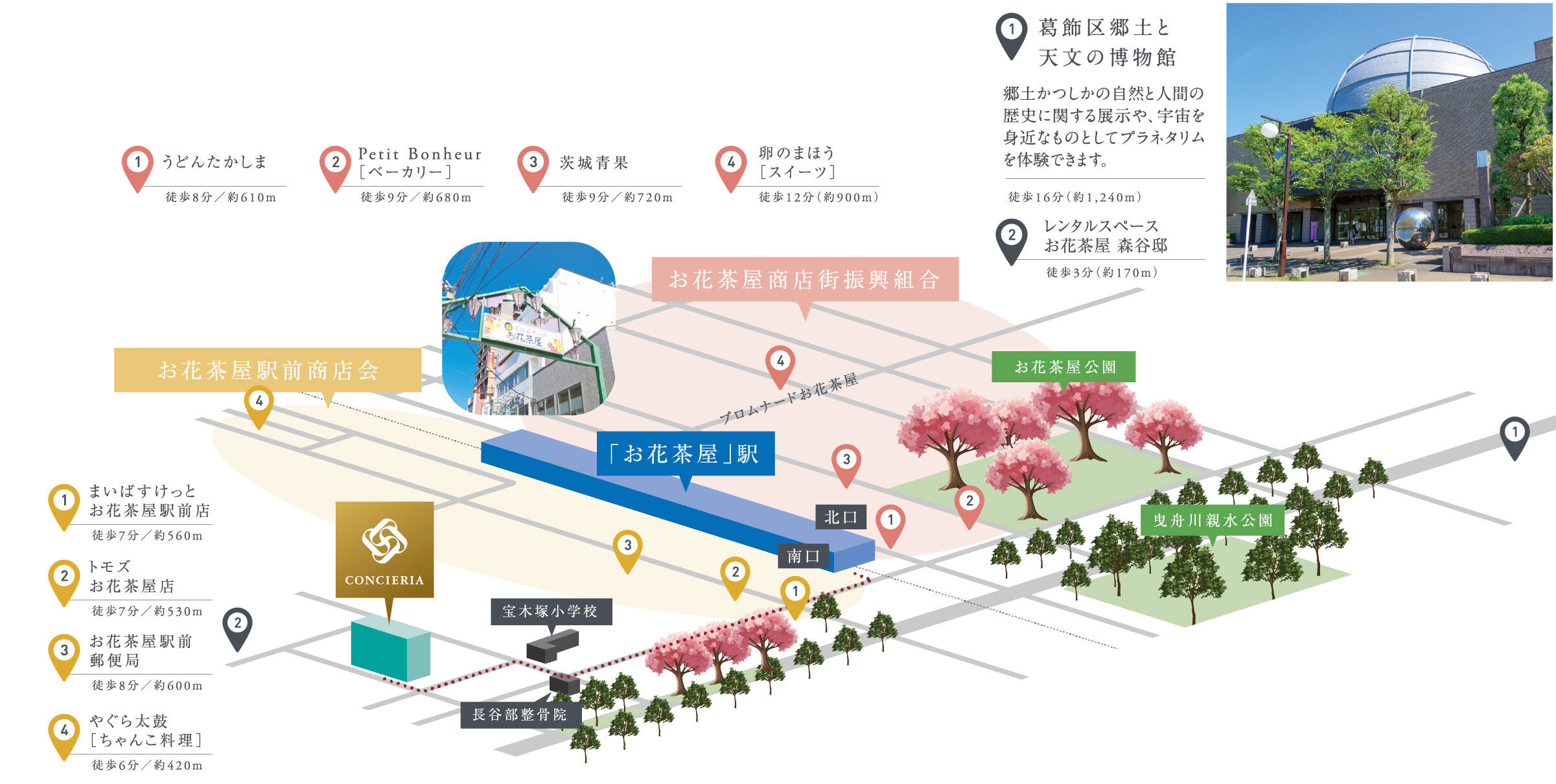 交通結節点としての高いポテンシャルを持つ「青砥」駅や大型商業施設や商店街で賑わう商業地「亀有」、大規模再開発により進化する「京成立石」といった特色ある三つの街の中心に位置する「お花茶屋」。都心や空港へのアクセスをはじめ、ショッピングやレジャーなど、多彩な利便を日常利用できます。