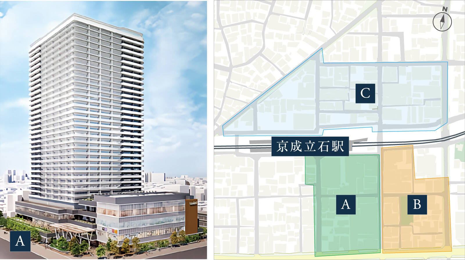 京成立石駅前に地上34階、地下1階、高さ約125m、総戸数700戸の住居と、延べ面積約91,700㎡の店舗からなる高層棟などの整備を計画しています。