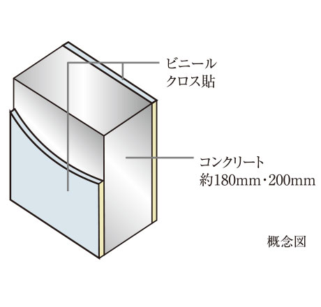 隣接住戸の生活音の伝わりの軽減やプライバシーに配慮して、約180mm・200mm厚のコンクリート戸境壁を採用しています。