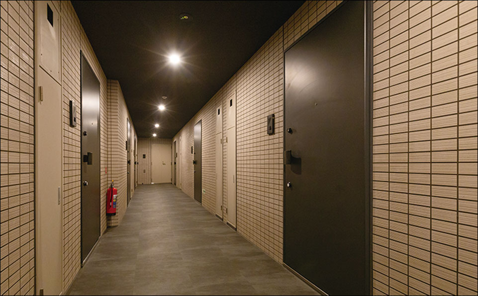 1階共用廊下は内廊下設計を採用することで外からの視線を遮りプライバシーを確保。床は、落ち着いた色調の石目調長尺塩ビシート仕上げとし、清掃性にも配慮しています。