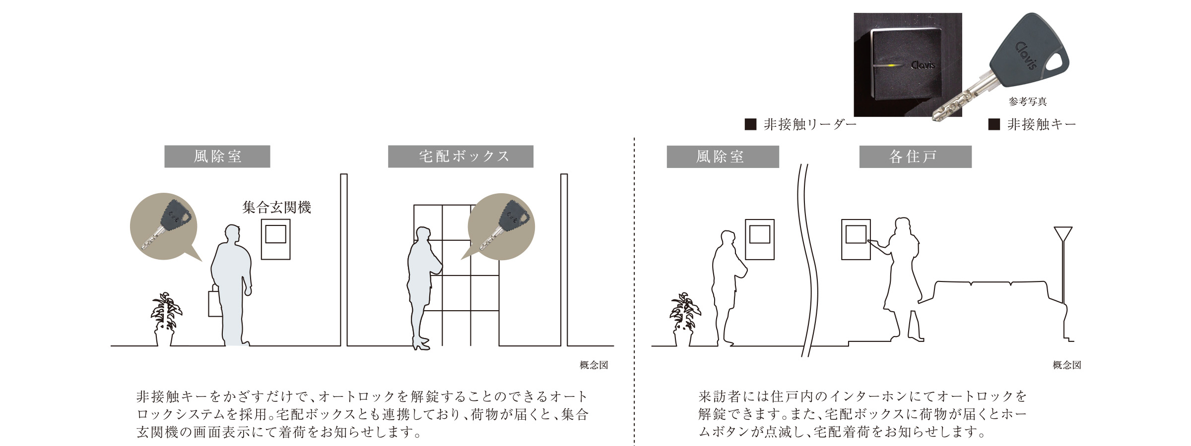 非接触キーをかざすだけで宅配物の受け取り操作が可能な宅配ボックスを採用。配達の際、業者と直接顔を合わせることなく荷物の受け渡しができるため防犯にも有効です。