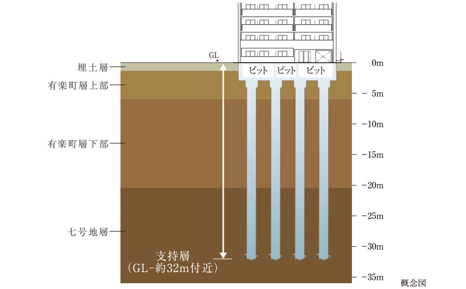 □地盤:地震に強い建物づくりには、強固な地層を支持地盤とすることが重要です。本物件では、地下約32m付近の地盤を建物を支える支持地盤としています。