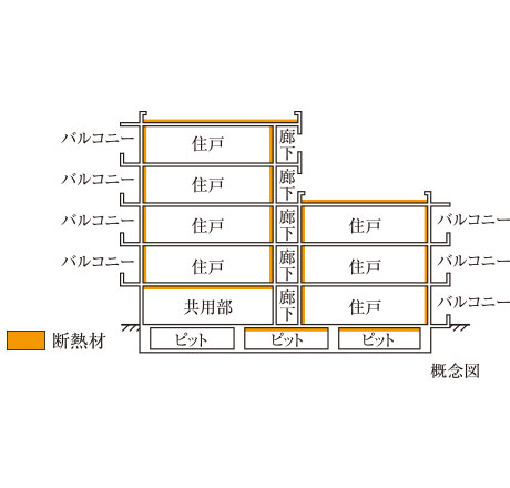 屋上や壁、住戸最下階の床裏などには断熱材を入れ、建物全体を包み込むように断熱対策を施すことで冷暖房効果を高めます。