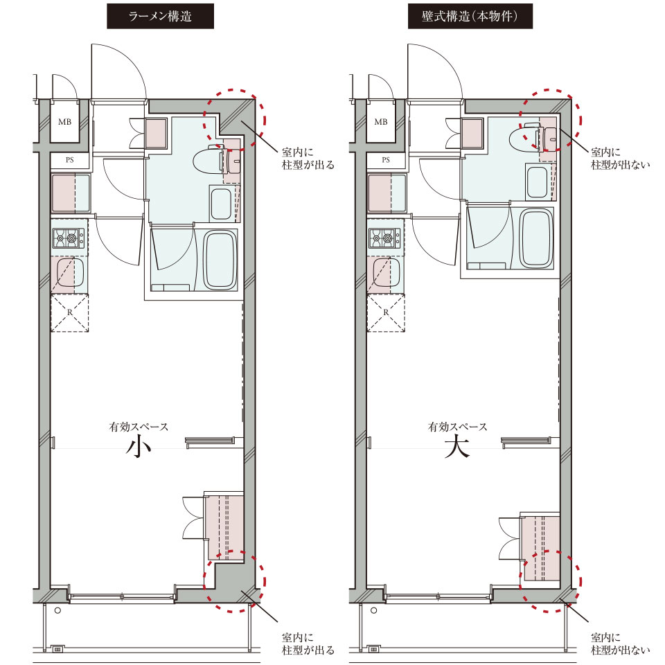 柱と梁で建物を支えるラーメン構造に対し、「壁」という「面」で建物を支える構造を「壁式構造」といい、主に低層の建物に採用される工法です。柱や梁型が室内に出ないため、室内空間を有効に使うことができます。