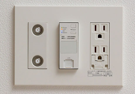 Wi-Fi一体型のマルチメディアコンセントを各住戸1箇所設置しています。テレビ、インターネット用LANポート、Wi-Fiアクセスポイント、コンセントが一つのプレートに納まっているため見た目もすっきりします。