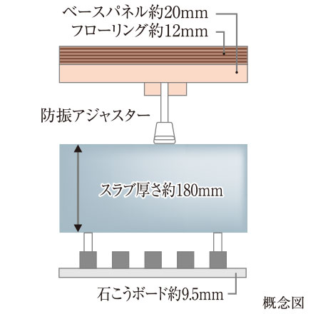 スラブの厚さを約180mm以上とし、遮音性に優れた⊿LL(Ⅱ)-3等級相当の置床システムを採用。スラブ面と床面の間には、防振アジャスターを配し、スプーンや食器等の落下音(軽量床衝撃音)が階下へ漏れるのを軽減しています。また、二重天井とすることで、将来のリフォームやメンテナンスへの対応に配慮しています。